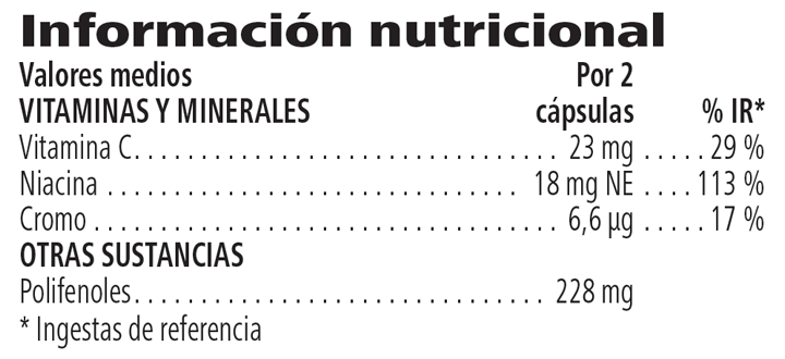 *La vitamina B3 y la vitamina C contribuyen al metabolismo energético normal y a la reducción del cansancio y la fatiga, mientras que el cromo contribuye al metabolismo normal de los macronutrientes y al mantenimiento de los niveles normales de glucosa en sangre.